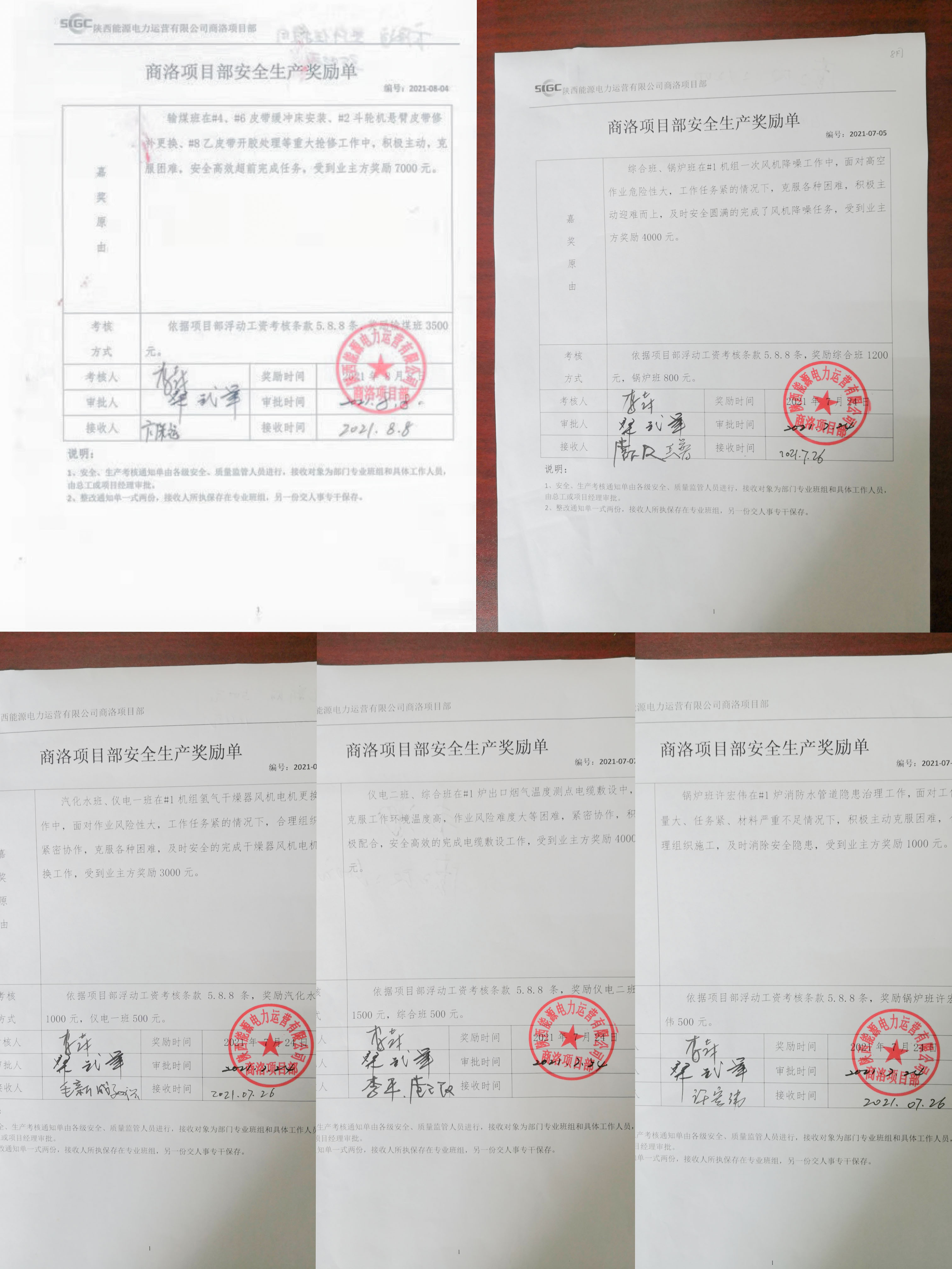 本周,商洛項(xiàng)目部接連收到來(lái)自商洛發(fā)電公司的五張獎(jiǎng)勵(lì)單通知單,獎(jiǎng)勵(lì)金額共計(jì)19000元,以嘉獎(jiǎng)在維保工作中表現(xiàn)突出的班組和個(gè)人,展現(xiàn)了業(yè)主方對(duì)項(xiàng)目部檢修工作中不畏艱難、勇于擔(dān)當(dāng)?shù)摹斑\(yùn)營(yíng)鐵軍”的充分肯定。