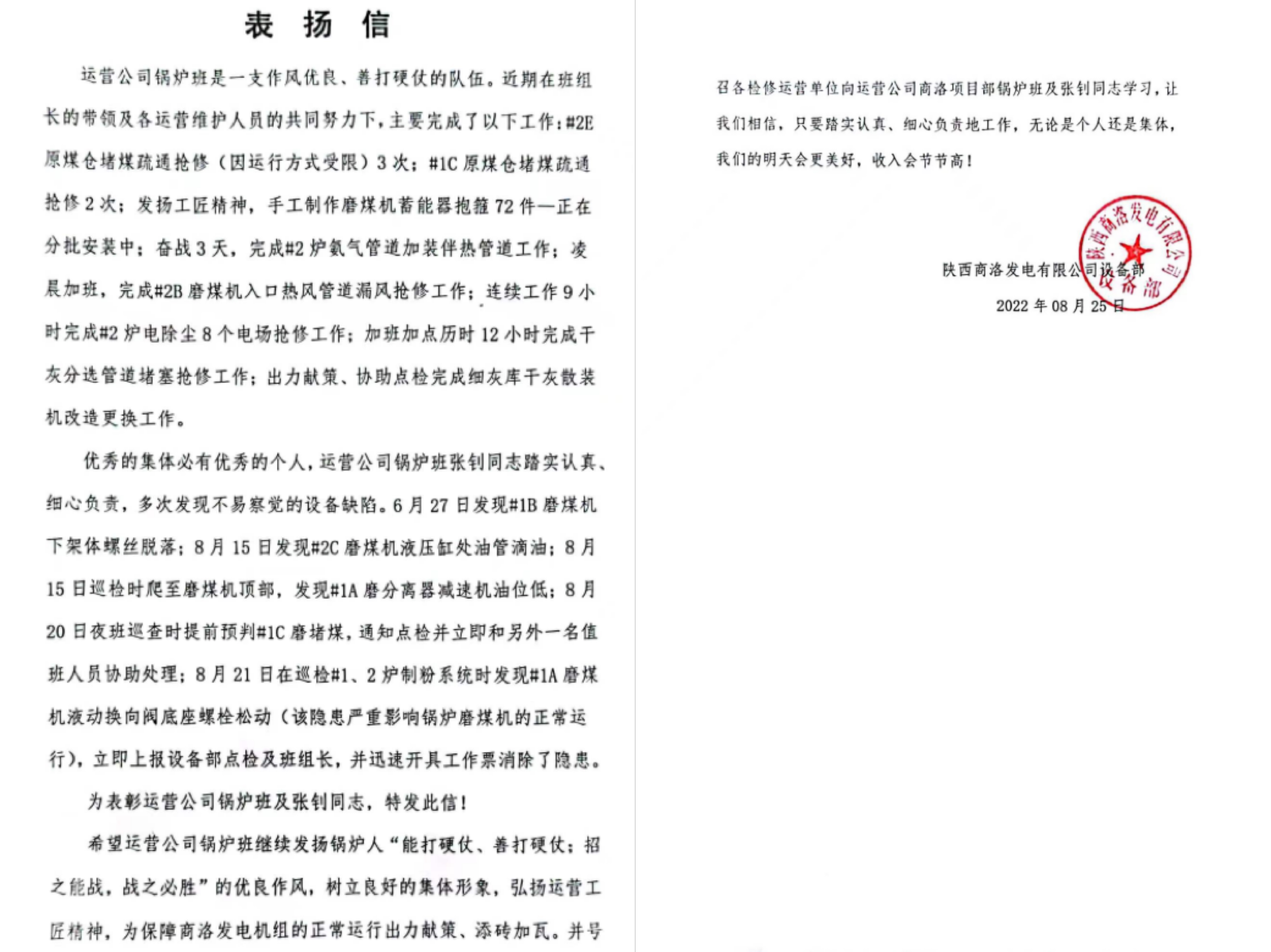 9月1日,公司相繼收到吉木薩爾發(fā)電檢修部、商洛發(fā)電設(shè)備部發(fā)來的表揚(yáng)信,對吉木薩爾項目部高效優(yōu)質(zhì)完成為期25天的設(shè)備專項治理和商洛項目部鍋爐班加班加點(diǎn)完成搶修表示感謝。